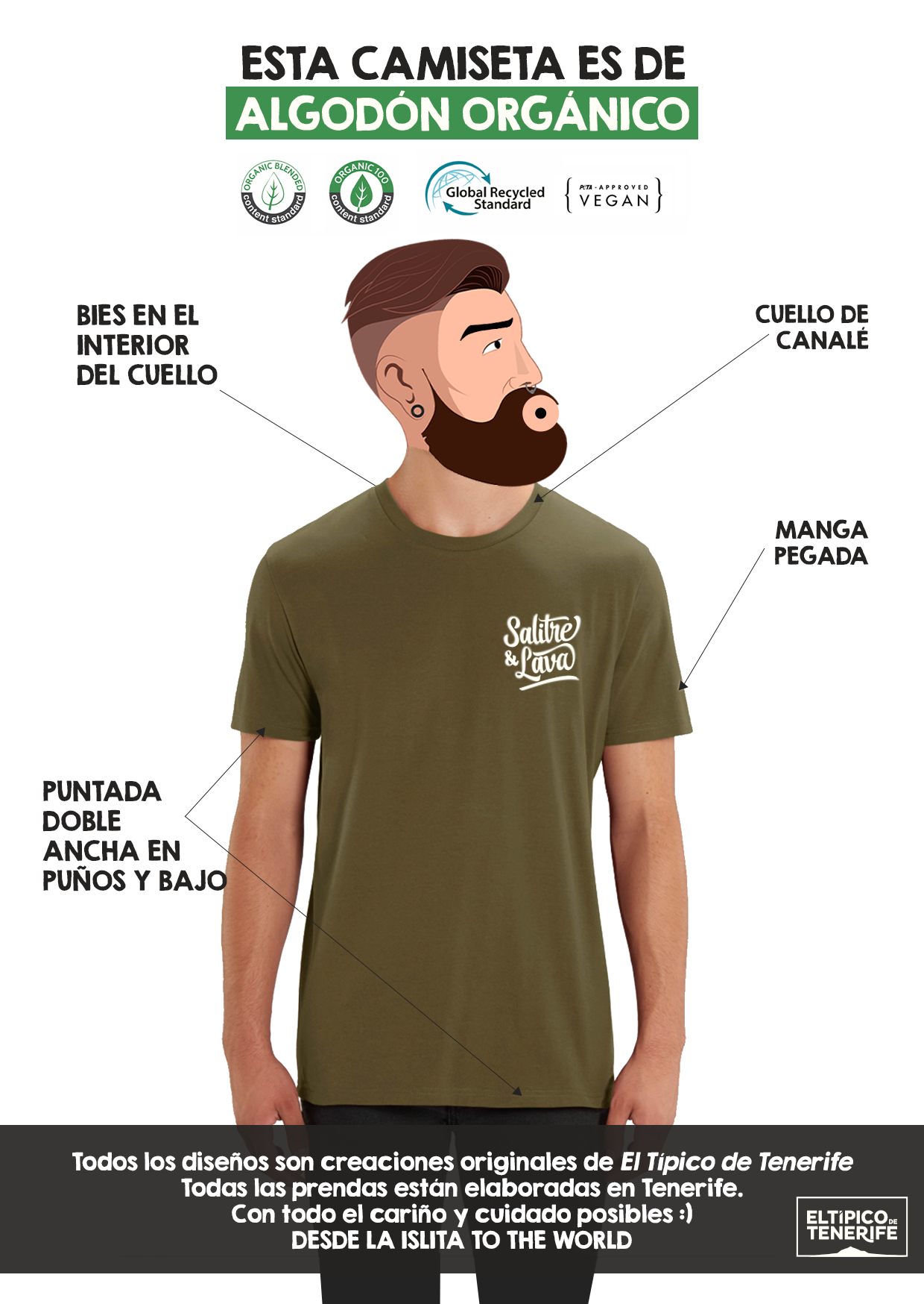 Finalizando el diseño aparece una flecha con la inscripción “estb. 22 million years ago” un guiño irónico y consciente al clásico cierre de los diseños para camisetas que presumen de fecha de fundación, pero con el del nacimiento geográfico de nuestras islas.