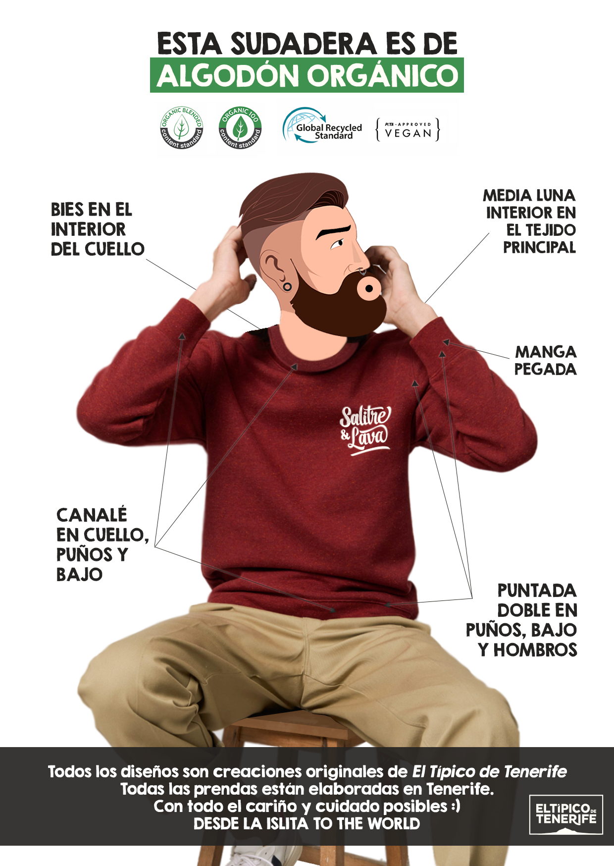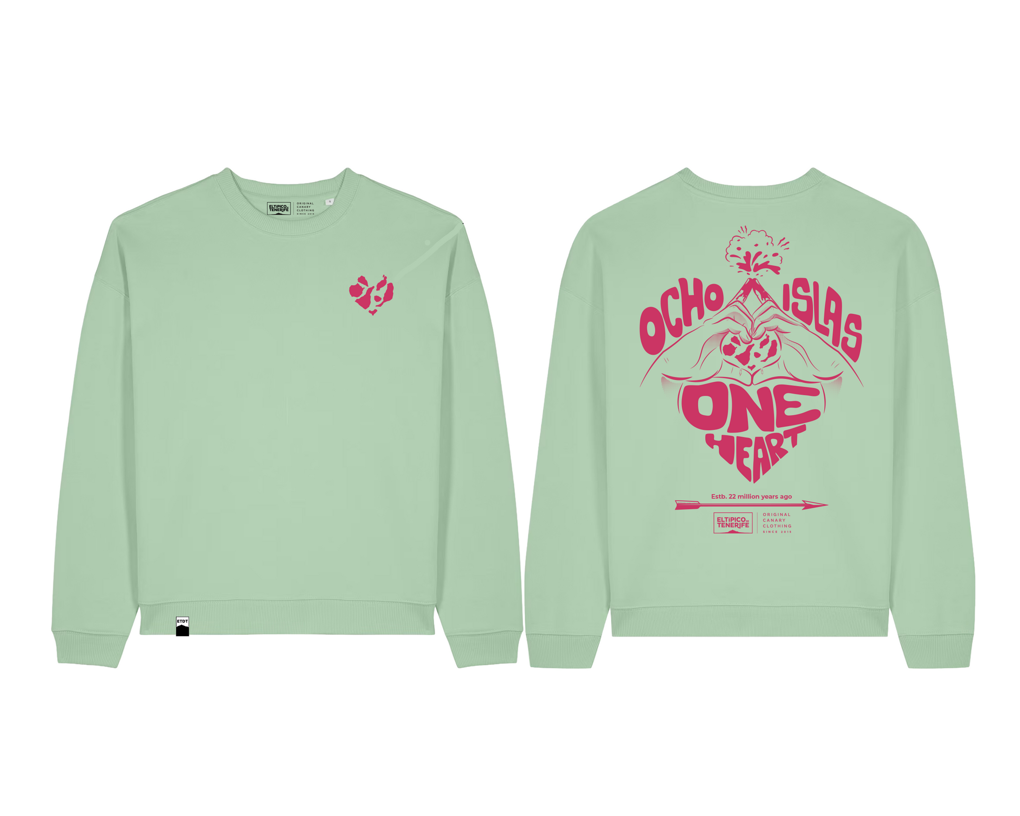 Por todo esto, cuando me decidí a llevar este icono desde mis redes a mis prendas, quise hacerlo dando un paso más y completando la idea con una versión más elaborada. El diseño de la espalda es el corazón arropado por otros corazones, pero también por un gesto hecho con las manos que resume la esencia de todo: amor por estas islas. Y, en el centro, los dedos índice se alzan representando un volcán que recuerda nuestra naturaleza y origen. Más que un gráfico, quise plasmar un gesto. Un recordatorio de que, aunque seamos ocho islas, compartimos un mismo latido.