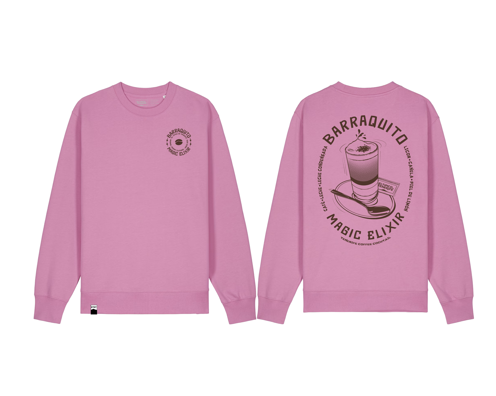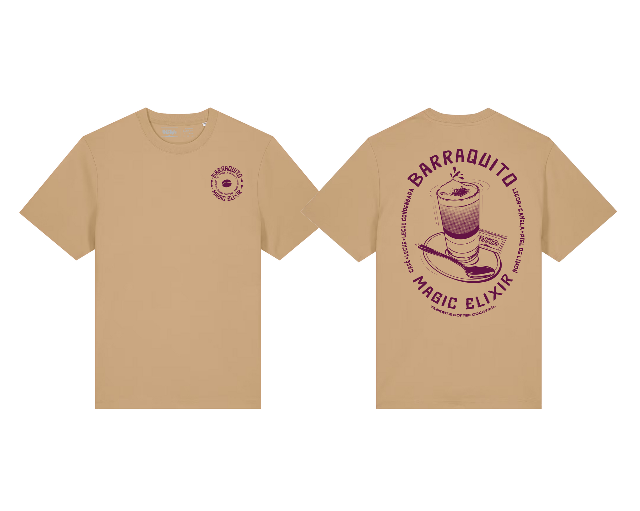 Este diseño busca capturar esa imagen cotidiana que puede reconocerse en cualquier bar: su clásico vaso alargado sobre su platito, acompañado de la cucharilla y el sobre de azúcar. Tanto en el grano de café del diseño frontal, como en la espuma del vaso en el diseño posterior, se puede descubrir la silueta del Teide. Siempre presente en la mayoría de mis diseños.