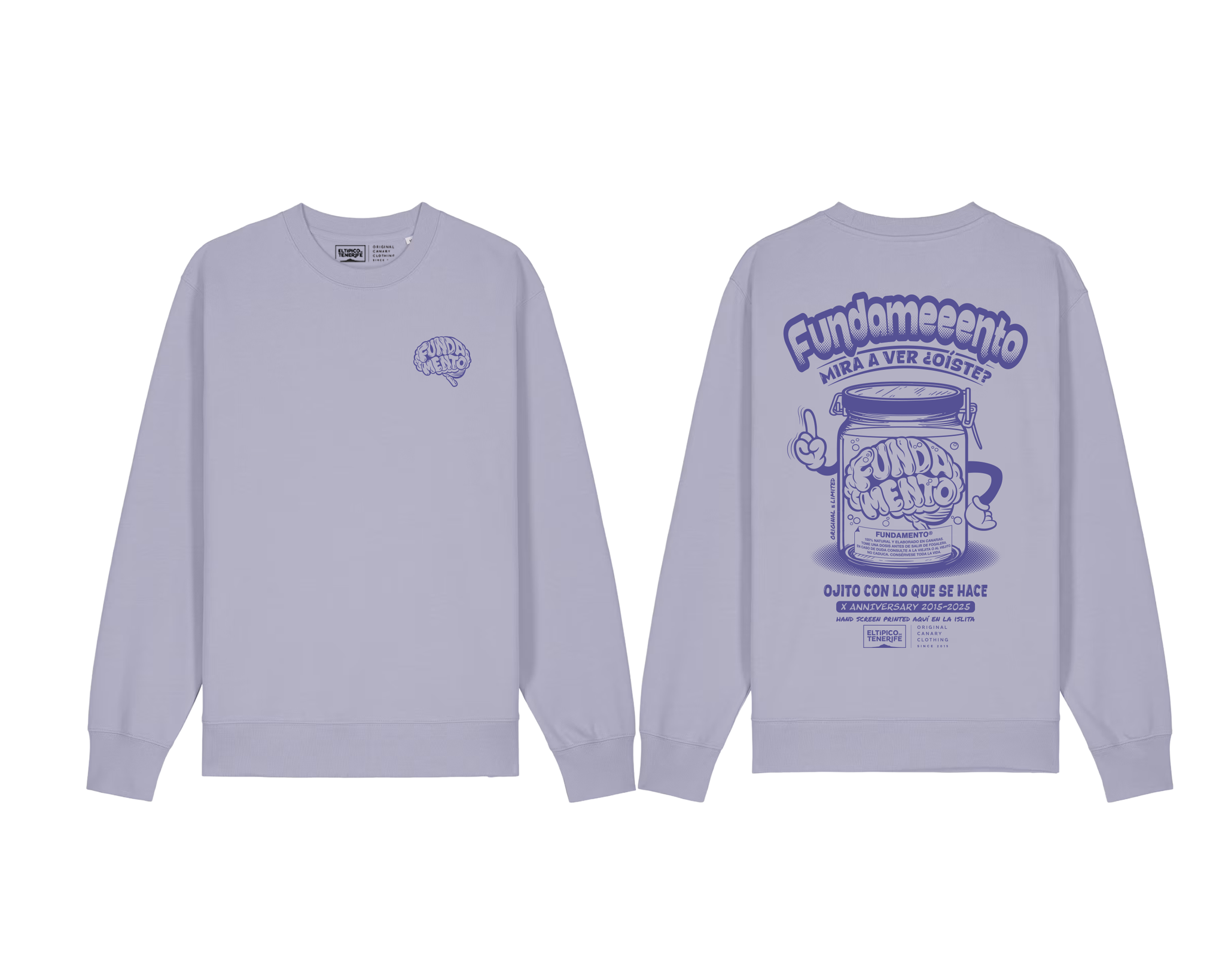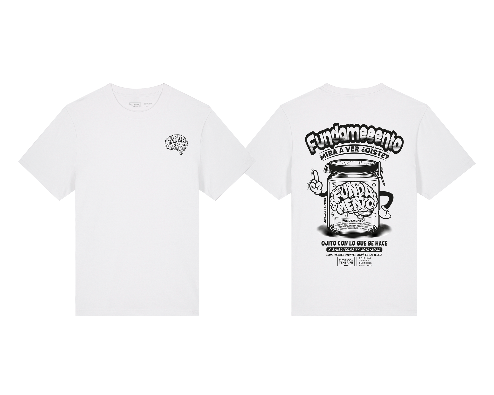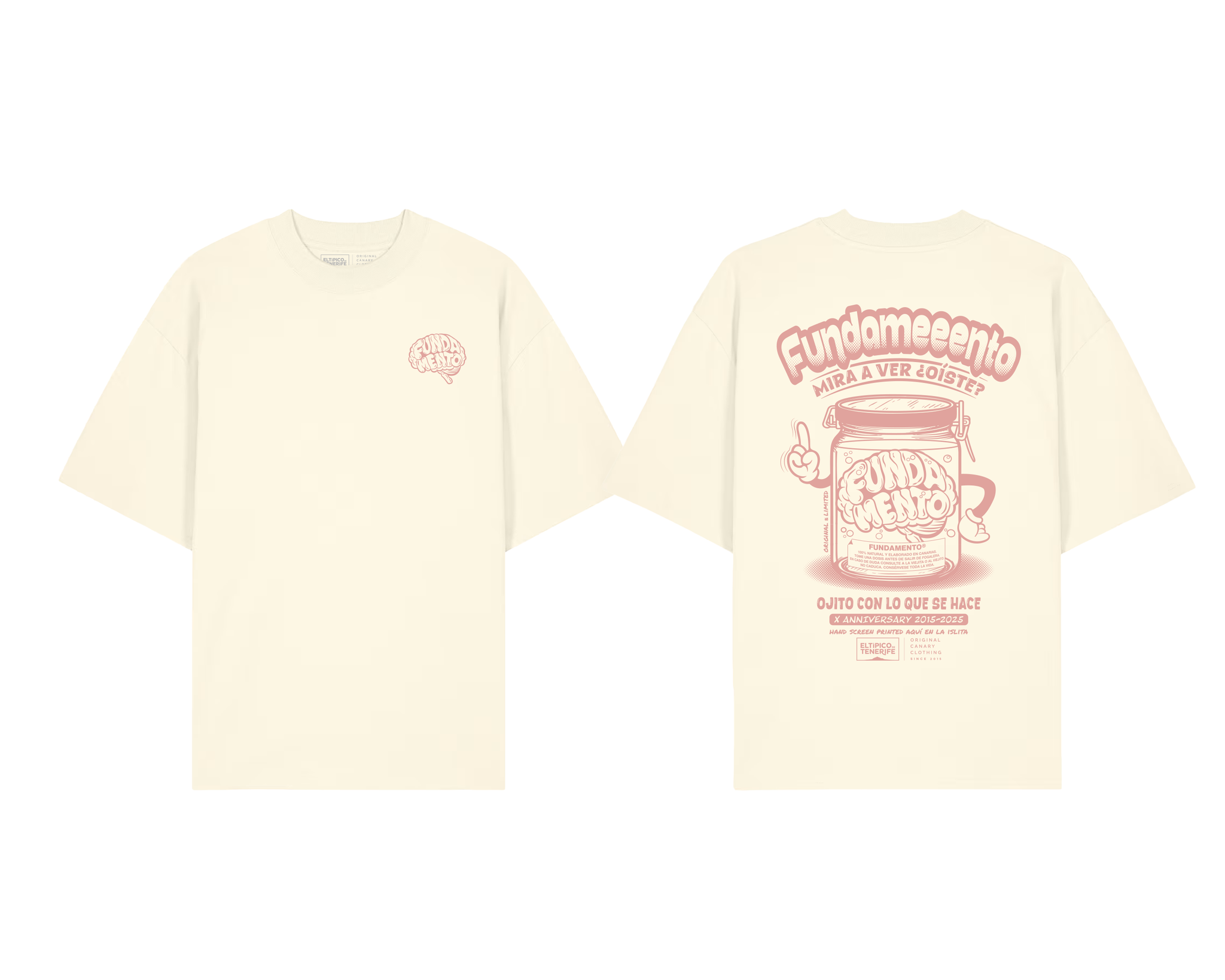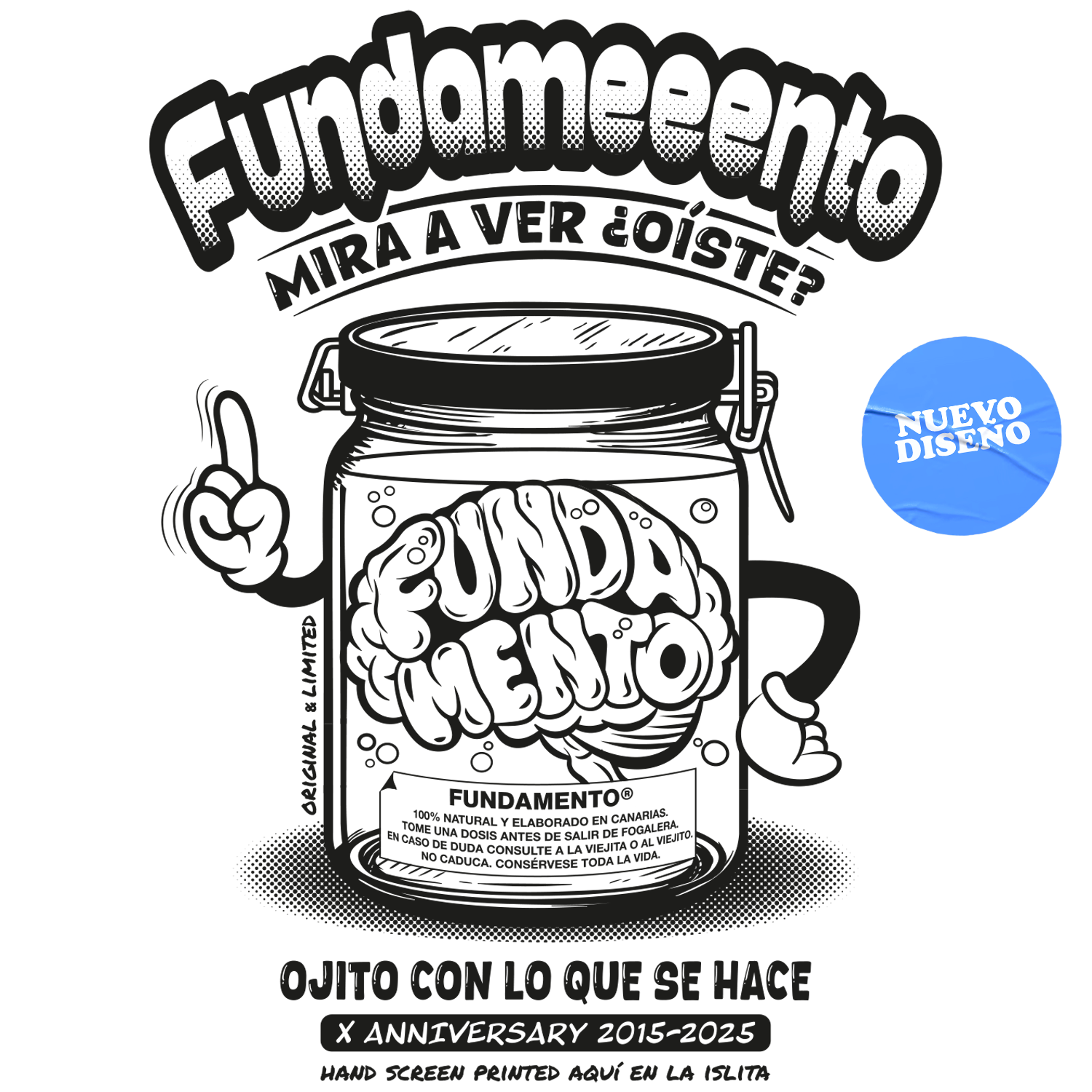 Sobre el frasco, el título aparece alargado como se pronuncia realmente (“FUNDAMEEENTO”), con ese tono que advierte con ternura. Está acompañado de un “Mira a ver, ¿oíste?” y un “Ojito con lo que se hace”, completando el trío de expresiones reconocibles.