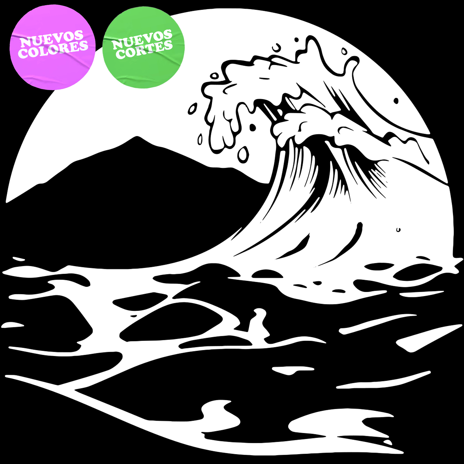 En este diseño, la ola enmarca un Teide que se eleva en el horizonte. Se trata de unguiño a La gran ola de Kanagawa, primera gran obra de la estampación. Es por ello que para este diseño utilicé esa técnica artística en la que se dibuja en negativo para que la imagen cobre vida al serigrafiarse sobre una superficie oscura.
