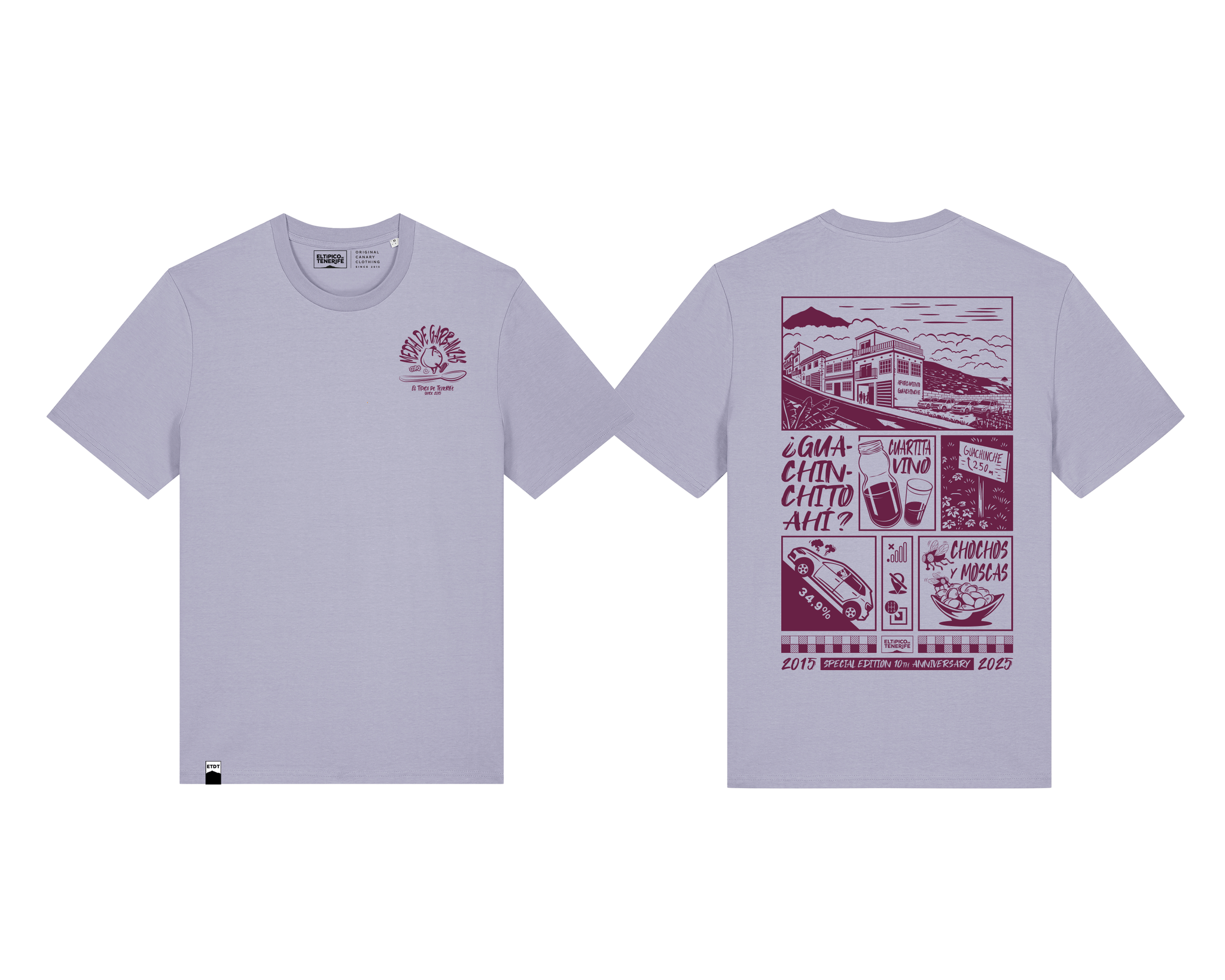 Este diseño es el primero de este 2025 y por lo tanto ya celebra los 10 años de El Típico de Tenerife. Por eso incluí un guiño muy especial: el personaje de las viñetas se cuela en una de las escenas. Un easter egg para unir las dos almas de este proyecto: las viñetas y los diseños de ropa.